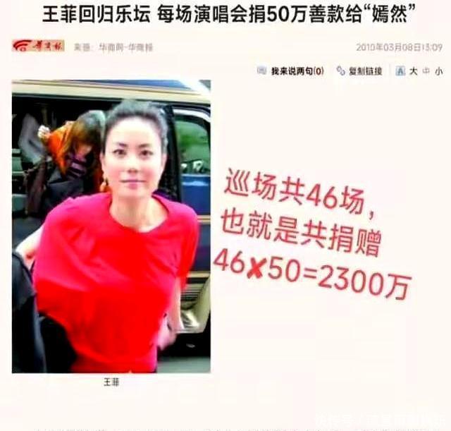 王菲开演唱会,场场都拨出五十万捐给基金。46场下来,就是2300万。她还亲自拉赞助、办慈善晚宴,有一年一晚上筹了五千多万。